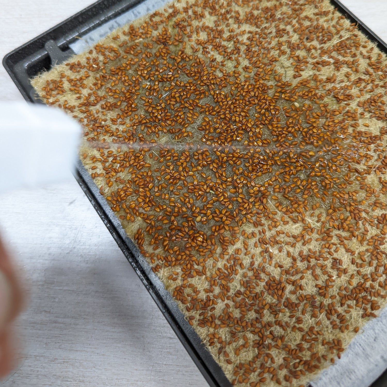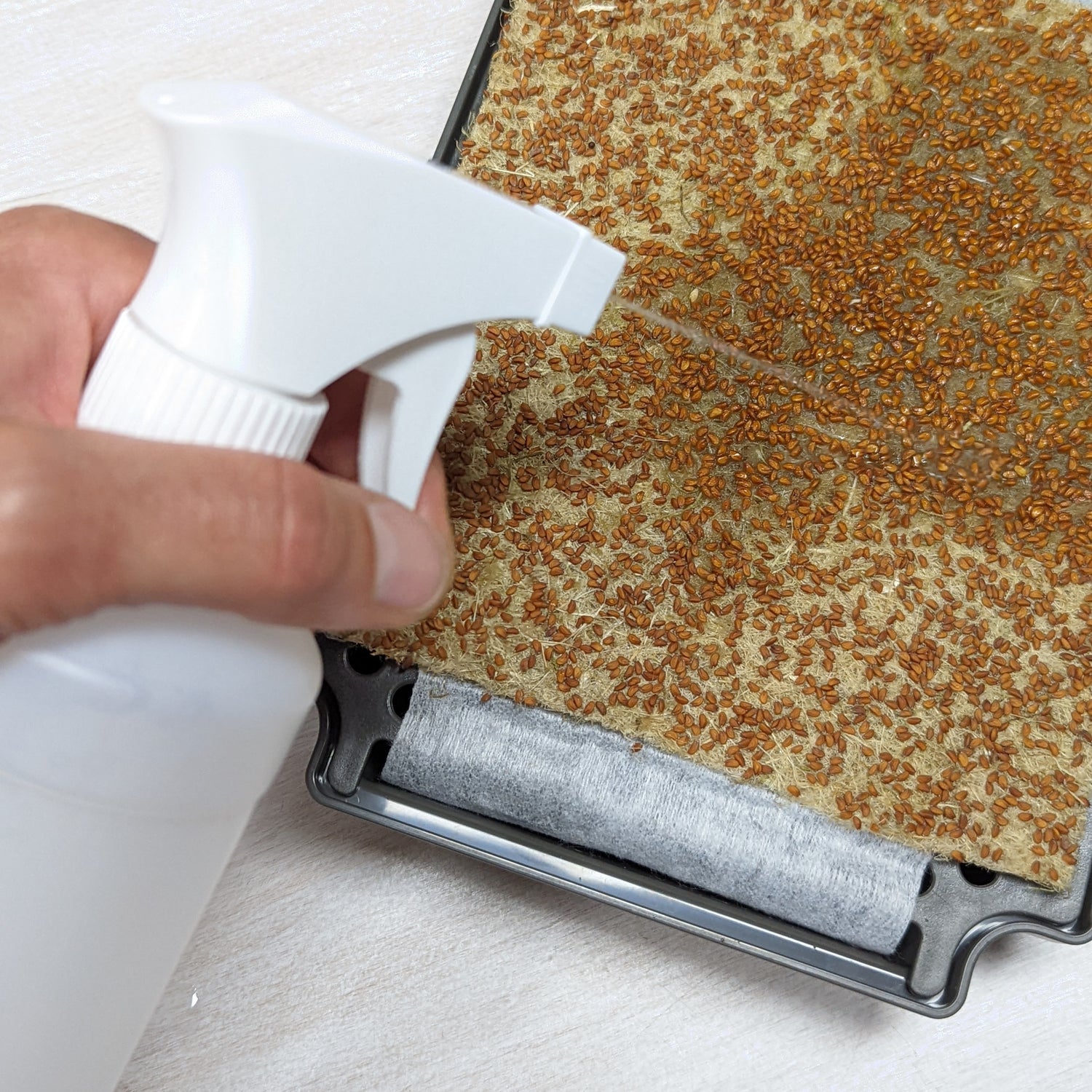 Bitte wässern Sie die Samenmatte vorsichtig mit dem Softsprüher. Achten Sie darauf, dass das Material vollflächig benetzt ist.